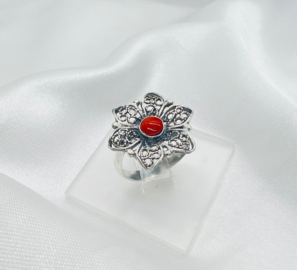 Anillo de Flor de Plata Quemada con Piedra de Espondilo Rojo.